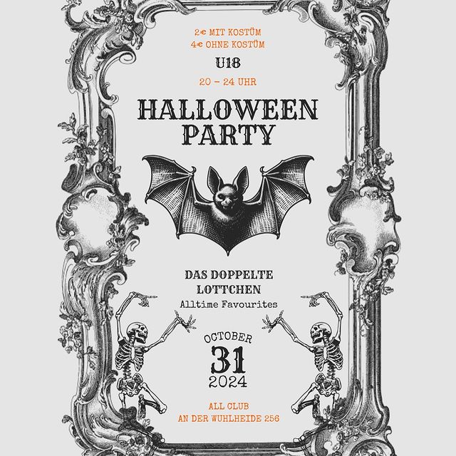 Alle jungen Menschen zwischen 14-18 Jahren aufgepasst: Am 31.10.24 feiern wir zusammen im ALL eine Halloween-Party von 20-24 Uhr mit Musik von den DJanes „Das doppelte Lottchen“ (All Time Favourites). Mit passenden Kostüm könnt ihr schon für 2€ mittanzen.